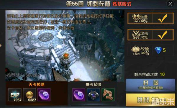 第六章枭雄霸术是目前开放的最高难度章节,这一章的关卡地图设定在雪山中。而这一章的难度更是直接再次达到了一个新高度,战斗力低于50万的玩家基本上都会成为被雪山掩埋的亡魂。不仅是装备、宝石、技能要跟上,对玩家的操作和走位更是有着非常严格的要求。玩家在闯关前,一定要花费500金币分别购买血量和攻击的增益buff,可以提升10%的血量和10%的攻击!