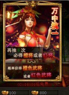 (3)每天可招纳(万中挑一)3次,每次间隔8小时,也可以花费100元宝招纳一次,800元宝招纳10次,10次之后必得橙将或红将,vip3有五折优惠