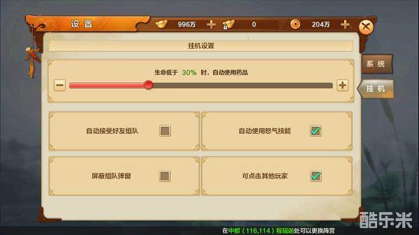 自动打怪的在线挂机,会在9级时开启,这时候就可以使用它了,但是建议在功力达到一定程度,并且有十分把握能够杀敌的时候使用,不然还是手动操作更加灵活一些。并且,你可以在设置中更改挂机设置。譬如生命低于多少时自动使用药品,或是需不需要自动释放怒气技能等等。