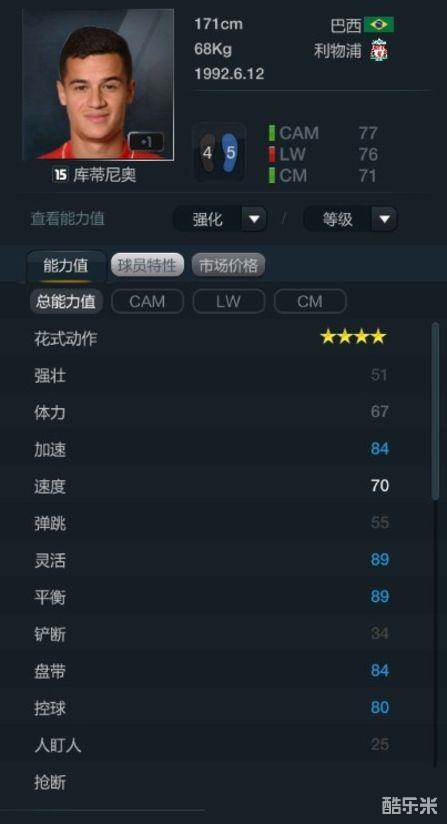 FIFAOnline315库蒂尼奥,从数据来看,是一位倾向于进攻的中场球员。灵活、盘带、控球的能力将为出色。属于小、灵的球员。速度为70,加速为84,让库蒂尼奥,一旦跑起来,则让对方的防守,有一些压力。库蒂尼奥的防守能力,不是很强,战术意识、反应、抢断等能力,不足。而且,体力是个最大的障碍。所以,年轻的库蒂尼奥,在目前的15卡中,价格低廉。不过,15库蒂尼奥,潜力很大,资金不是过于充裕的玩家,可以选择库蒂尼奥,并合卡使用。