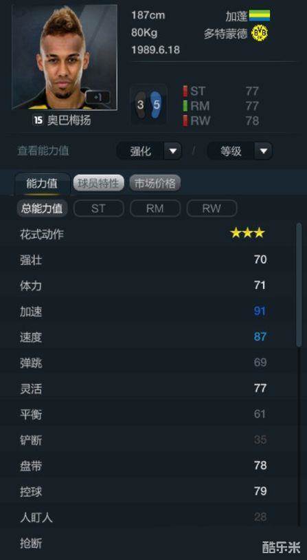 FIFAOnline315奥巴梅扬,最为显著的特点,就是极其优秀的速度和加速能力,达到87和91,这样的能力,让奥巴梅扬,可以利用速度优势,甩开防守能力,创造杀机。由于有飞翼的称号,使得奥巴梅扬,可以在边路迅速的突破防守,然后下底传中,为中路的队友制造机会。可以攻击,也可助攻。奥巴梅扬的体力,是71,这是个短板。在新引擎下,有速度方面的优势,使得奥巴梅扬,为多特蒙德套的极佳选择。目前,华东区15奥巴梅扬的价格不贵,玩家可以入手合卡。