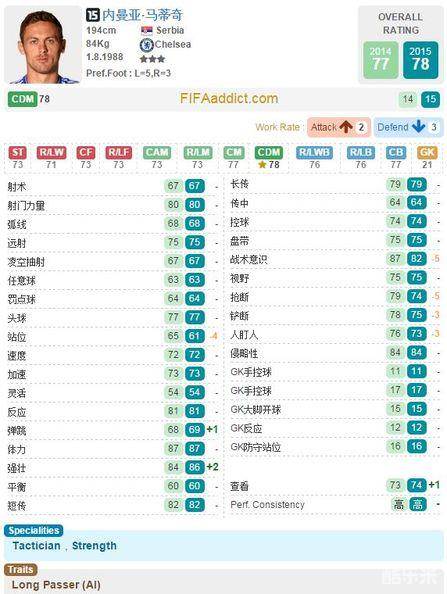 在模型已不算十分重要的新版本中,由于亚亚图雷等一干后腰的削弱,瘦弱体型的马蒂奇仍然能脱颖而出,占据了一个重要的CDM,可以说明星套的玩家非他不“娶”,原因在于模型依旧强大(194cm/84kg),同时在保证高强壮的同时有着良好的体力,在传球和战术意识上也不落下风,可谓是名副其实的绝佳CDM,另外新版本还需要看球员的参与度,攻2守3的球员参与度也是保证了防守中不会乱跑。综合以上情况,把他推荐为15卡第一CDM也不为过。