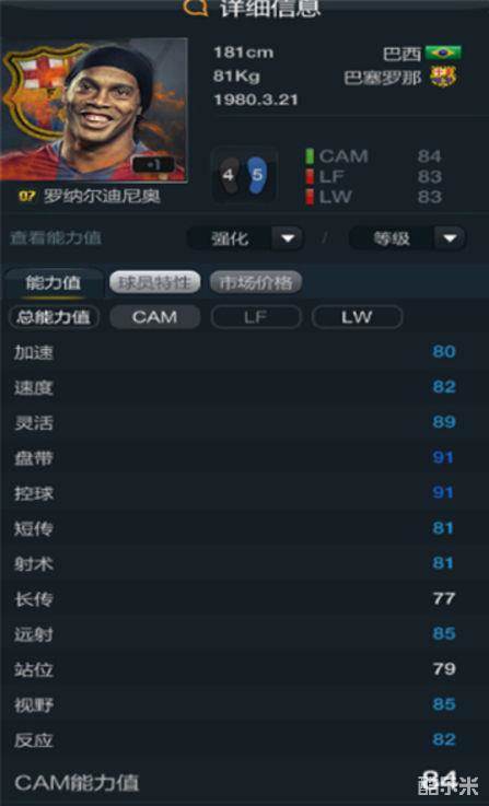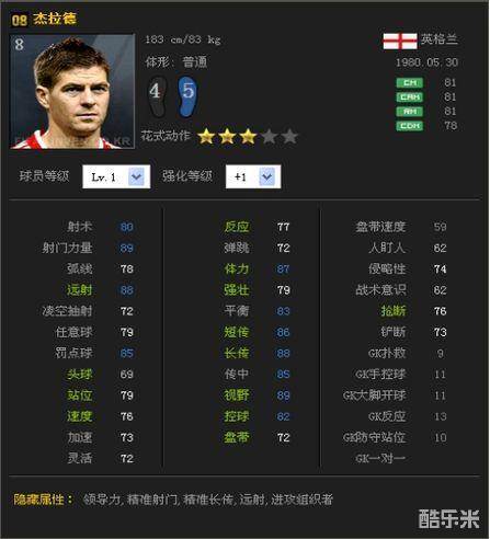 两个风格不同的中场球员,参与度都是中庸的攻2守2。这两个球员相信不需要做过多介绍,杰拉德的远射可谓在新引擎如鱼得水,防守能力也很出色,只是盘带属性并不高影响手感。小罗的体力决定了新引擎更加适合CAM的位置,80+的双速,90+的控球盘带外加5星花式,几乎可以起飞了。同类小罗攻强守弱的球员还有09和10赛季的古尔库夫也很受欢迎。