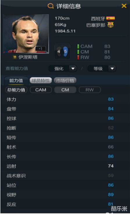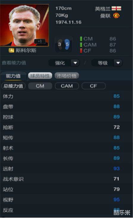 笔者按高到矮的顺序排列就是想说明目前来说现在身高越矮的明星球员,手感应该是略胜一筹的。不是说新引擎身高不重要,只是中场或者中前场位置是对身高最没有限制的一个位置。11伊涅斯塔,四星花式,完美的攻3防2的参与度,高体力、高控球盘带。完美的隐藏技能和传球属性,可以说完美适合新引擎对中场位置的一切要求,既能控球组织进攻,又能精确制导找到快速前插的队友,时不时还能跟上来一脚灵光一现远射。170cm的身高带来无与伦比手感的同时也制约了小白的高空球能力。11小白银卡可用,强3卡可用,单卡可用。 曼联传奇来袭,生姜头与小白相比风格类似身高无差,数据也更胜一筹,而且拥有初始93的远射数值。所以千万不要给斯科尔斯在禁区弧顶起脚打门的机会。但在笔者实战看来同样攻3防2参与度的生姜头在场上的存在感并不如11小白,但是一脚远射实在惊为天人。