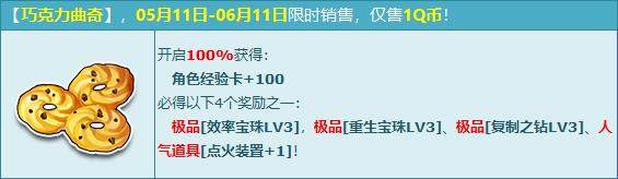 5月11日至6月11日,购买角色经验卡+100,必得【巧克力曲奇】,额外必得4个奖励之一:【点火装置+1】1个、【效率宝珠LV3】1个、【重生宝珠LV3】1个、【复制之钻LV3】1个!