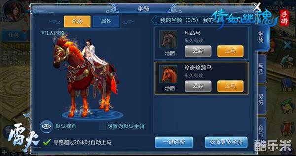 玩家可以通过游戏中的易市进行马匹买卖,同时也能在盘古清阳战、寇岛围攻以及绛雪与元霜游戏玩法中获得掉落的马匹道具。