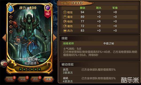 我们再来看看这张卡:环海蛇神,技能使己方神射营物攻提高55%+40,己方龙枪营物防提高65%+55。让枪兵弓兵发挥所长,使这两个兵种更加搭配。
