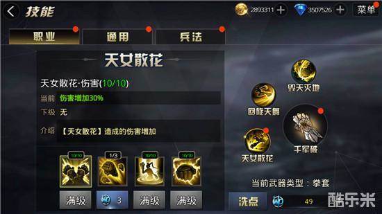 1、天女散花·伤害:增加此技能伤害,每升一级增加3%
