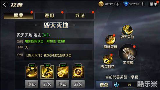 2、毁天灭地·连击:点满可获得4段攻击,附加击飞和击退效果。