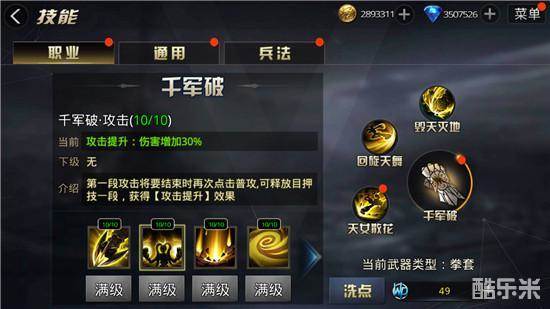 2、千军破·拳套(拳刃):使用拳套(拳刃)能增加伤害1%~10%。