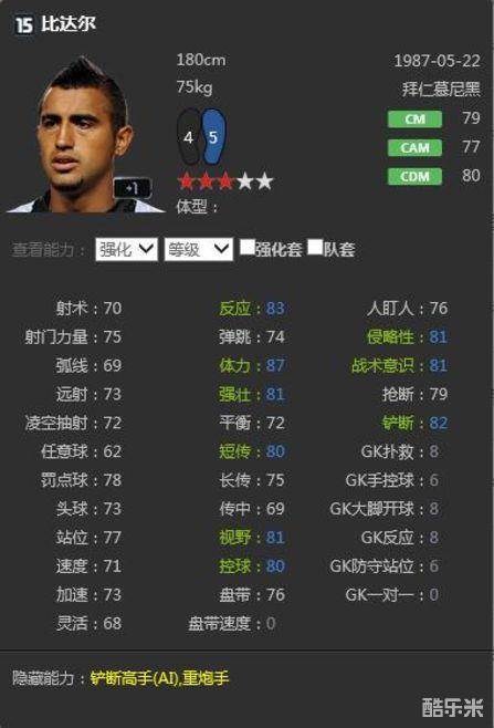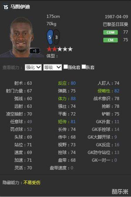 15马图伊迪,也是一名老将了。87年出生的法国中场,如今在大巴黎尽职尽责。作为一名中场球员,马图伊迪,有着高反应和高侵略性。在防守端,更具优势。进攻参与度和防守参与度都为高,而有着不易受伤的特殊能力,让马图伊迪,在一场比赛的后期,其余球员体力不支时,可以发挥出自己的实力。15马图伊迪的价格不高,玩家可以考虑引入。