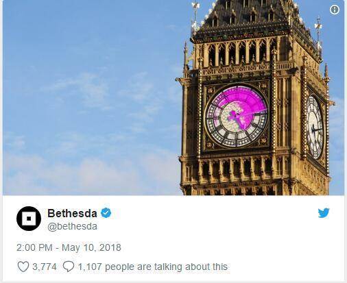 今天贝塞斯达Bethesda在推特上连发推文,放出了神秘的图片和信息。图中出现了英国大本钟和升空的火箭,都被绘成了粉红色。