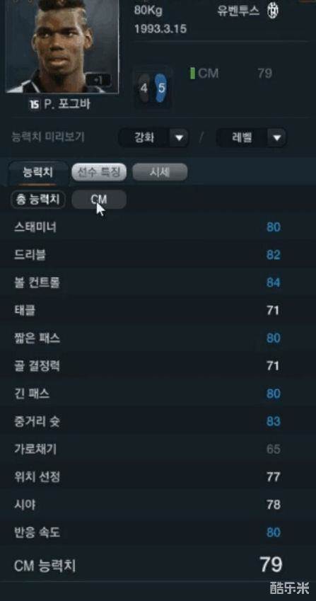 CM:远射83、头球78、站位74、速度73、反应74、体力80、强壮82、短传80、长传73、控球82、盘带80、视野77、抢断72;
