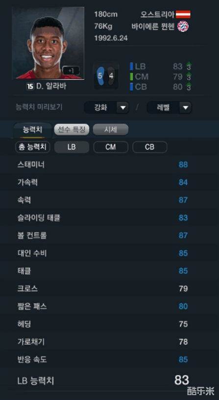 FIFAonline315卡,在FIFAonline315卡阿拉巴的数据中,可以看到阿拉巴的能力有明显的提高,作为拜仁的当家全能选手,阿拉巴,是一颗冉冉升起的巨星,14阿拉巴的能力已经很犀利了,而在15卡中,阿拉巴,将变得更为全面,从冉冉升起的巨星,成为一名成熟的超级球员。