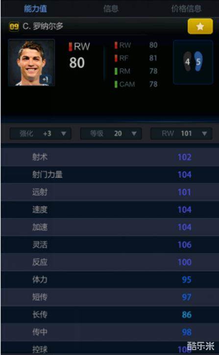 左边锋09C罗(毫无疑问你要想拥有皇马队就必须拥有C罗,关键先生的作用我不必做多说明,但为什么要选择09C罗,因为对于平民玩家来说你想拥有一个+3 的14C罗是很难的,所以选择性价比最高的就是09C罗,这样可以确保+3,让你的球队在球员强化组合上又提升了一个数值)