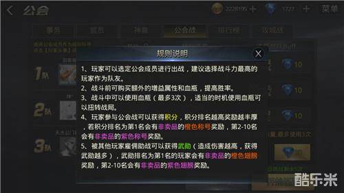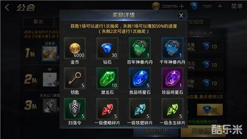 奖励:公会战的奖励很丰厚,进行公会战每成功一次或者失败两次,可以进行一次抽奖,奖品包含金币、钻石以及各种材料。另外,根据个人的表现,玩家还可以会的一定的武勋和积分,排行前十的玩家,可以获得稀有称号和稀有翅膀。