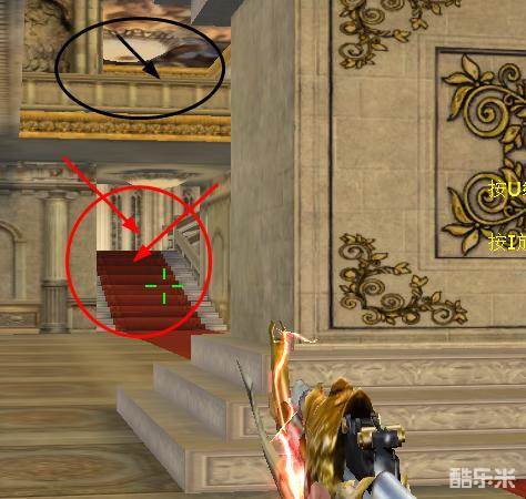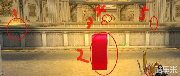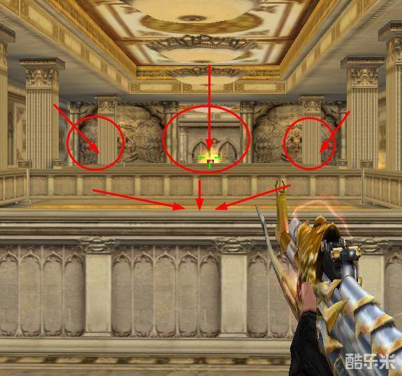 1.狙击手取人头最多的地方就是这了,红色箭头标志的地方都能猎杀,最下面的三个箭头代表着向前走几步,可以猎杀前面的人,打前面的时候向后退几步,可以防止下面的人猎杀,取人头快捷。