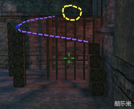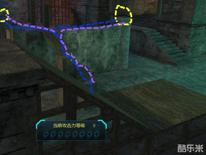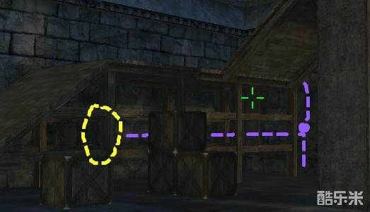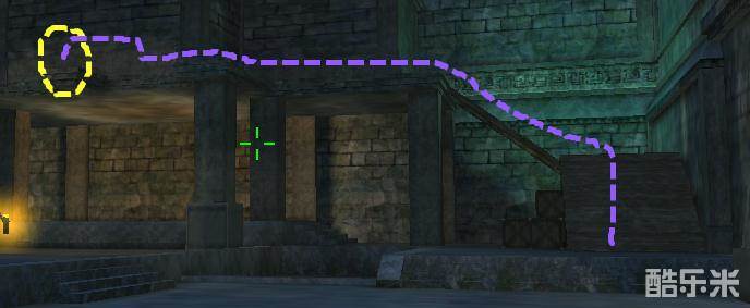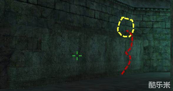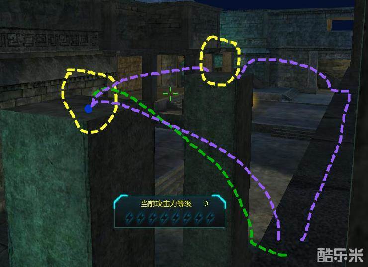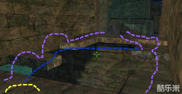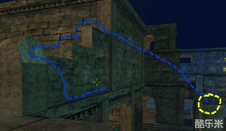 这里是比较有名的,基本每局都会有人守。路线有点乱,希望你们能够看明白,那个有一个蓝点意思是跳到那里后开加速过去。
