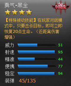 火线精英勇气-黑金介绍,火线精英勇气-黑金属性。在全新的生物科技理论下,通过科学家大量实验和实践后研发而成的又一支黑金系列武器。在玩家对战的情况下,每击杀一名敌人都可以恢复生命。