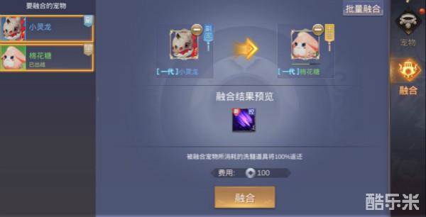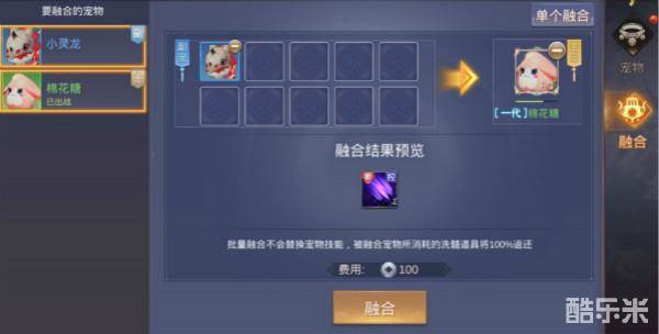 宠物融合:分为“单个融合”及“批量融合入”,融合可以增加宠物技能,被融合宠物所消耗的洗髓道具将100%返还。
