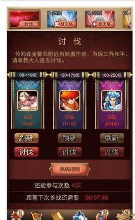 掌教等级到达80级可在奇遇界面点亮讨伐系统,每天可有五次机会参加活动,根据掌教的等级,可以参加与三种不同等级段的讨伐任务,讨伐有5种不同难度的任务,难度越高奖励越好,最高难度讨伐胜利后必然会得到经验战魂和其他丰厚的奖励,如任务难度过低或者过高,可通过刷新功能提升或者降低任务难易度,每一场讨伐战斗结束后,无论胜败,都有10分钟冷却时间。