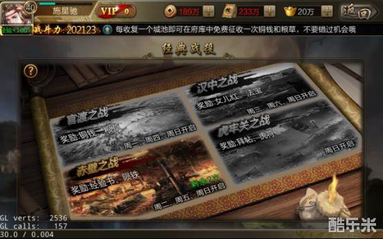 经典战役在每周一、周四、周日时开启官渡之战,成功挑战关卡后将获得大量铜钱与粮草奖励,机会不容错过。