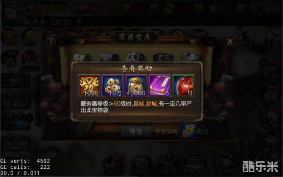 军团宝库会根据军团占领城池数量及规模产出各类宝箱,使用令箭即可进行夺宝,宝箱中会产出大量铜钱及粮草。