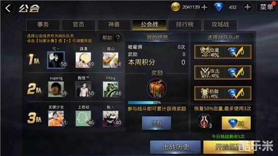 公会战是游戏比较经典的玩法之一,随机匹配其他公会进行战斗。玩家们可以选定公会成员进行出战,共有3个队伍,每个队伍最多只能上3个成员。战斗前可以使用钻石买增益BUFF,和恢复血量的血瓶,不过只能使用3次。