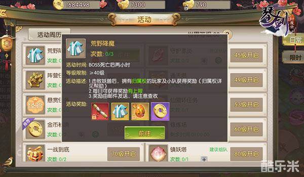 今天小仙要说的就是日常高危活动,荒野降魔!每天可以获得三次免费获得降魔奖励的机会,达到40级及以上可参与活动,每个boss死亡后两小时刷新,重点是,击败妖兽后,拥有归属权的玩家及该玩家队伍成员可获得奖励。