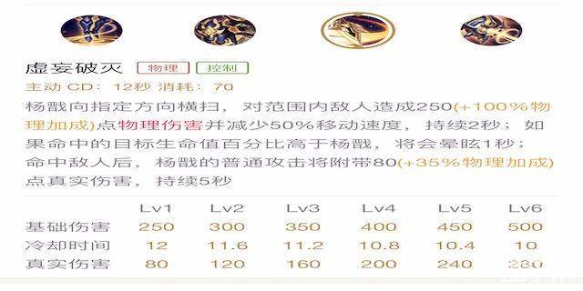解析:横扫杨戬前方扇形区域造成伤害,若目标生命值百分比高于或者等于杨戬则被眩晕,反之则被减速。二技能命中目标后接下来的5秒内杨戬普通攻击将附带真实伤害,当有此效果时杨戬武器会发光。这是杨戬最主要的输出技能,配合强化后附带真实伤害的普通攻击可以打出高额伤害。