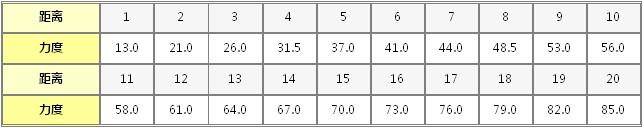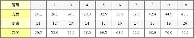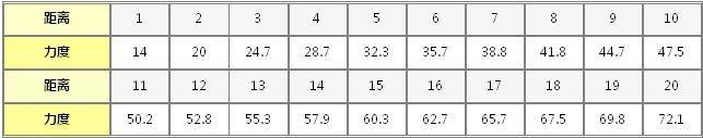 在面对对手的情况下,使用“↑ ↓”键将角度盘中显示的角度调整到50,测量自己与对手的距离。测距完毕之后参照下列公式进行发射炮弹的力度调整,下面50度不同距离使用的力度: