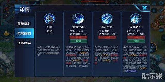 解析:赵云跃向空中,向指定区域发动雷霆一击,对范围内敌人造成伤害并且击飞1秒,同时标记敌人为感电目标。赵云的普通攻击和技能攻击会对感电目标造成额外的法术伤害。该技能冷却时间不长,位移距离也相对可观,攻击也是范围的AOE,击飞也可以当做群体控制,配合一技能的小段位移,是峡谷中赵云七进七出的保证。