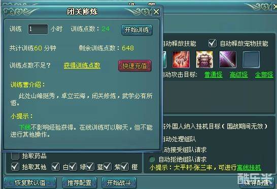 如果精力值为0了,又不能补充精力值。有什么可以做的呢,做任务和打BOSS是不消耗精力值的。只要记住,除了打怪只能获得1经验和不掉落物品外,其他是没有影响的。当然也可以试试去太平村-张三丰处离线挂机获得经验。打开挂机设置,在右下方有离线挂机,点击后设置一下训练时间就可以了,没精力值离线挂机是有经验的。