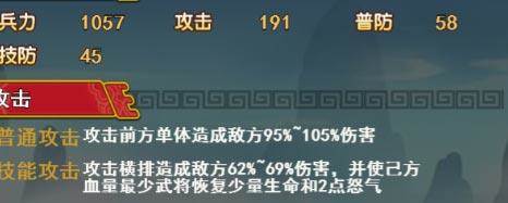 技能造成横排62%~69%伤害,并且使己方血量最低武将回复少量生命和两点怒气。
