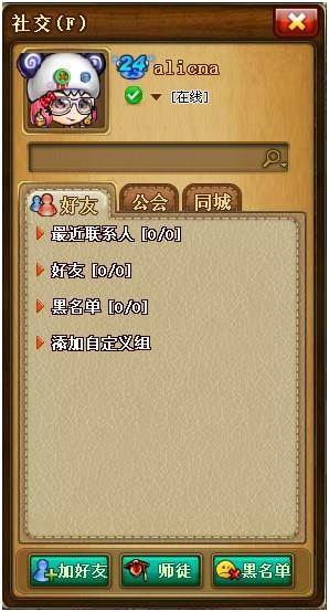 在主选界面选择“社交”即可进入好友聊天界面,在这里可以进行添加好友、黑名单、自定义组等操作。双击好友名称可打开聊天窗口,单击好友名称可以查看好友的个人形象及装备等信息。