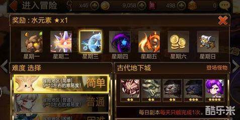 一个星期七天的奖励都不一样,今天是星期三,小编选择副本简单模式胜利得到一个魔法型英雄水元素,水元素可作为魔法型英雄进化的材料。如下图,星期一是土元素,星期二是光元素,星期四是暗元素,星期五是火元素,可以分别作为对应型英雄的进化材料。星期六可以获得金币,星期天能获得装备箱。每天的奖励都不一样,下个星期又进入下一轮。和冒险模式不一样,冒险模式里面每次出现的怪物只有三个,每日副本这里出现的怪物有5个,和你的英雄数量相当,所以要注意哦。