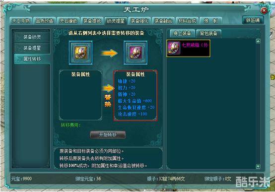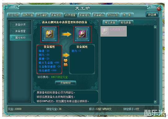 最后编辑于7年前一、打开天工炉界面,点击锁灵提星,选择属性转移,选择要相互要转移的装备,如下图:
