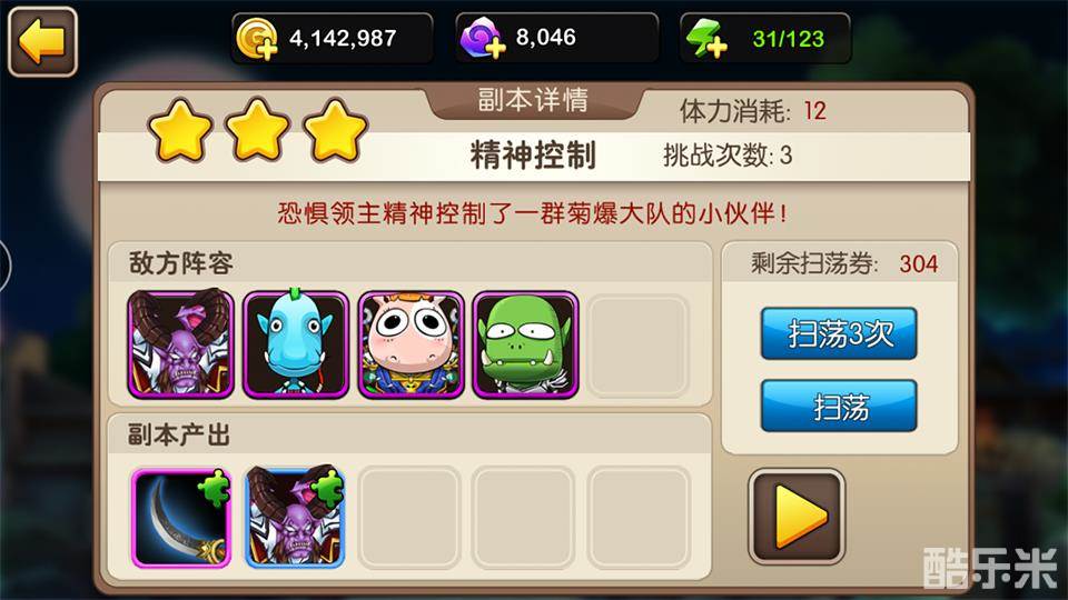 本关难点主要集中在最后一个场景,恐惧领主和被他控制了的四个菊爆大队小伙伴非常难缠。恐惧领主作为关卡BOSS血量非常厚,击杀需要一定时间;藏在恐惧领主身旁的呆贼爆发力相当高,让其放出大招的话我方容易崩盘,一旦减员三星通关的目标也就成为泡影了;在后排的劣人和傻馒很难快速击杀,他们的输出能力都是非常可观的,会给我方相当大的压力。