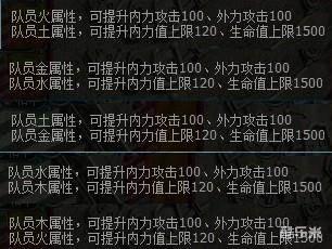 当玩家达到16级后,通过完成一系列的小任务,可免费获得一个五行属性,组队时,如果你和队友的五行属性可以相生或者相克,就能有很可观的属性加成,当你和队友的五行属性相生的时候,被“生”的那个人将获得内力和生命值上限的提升,你和队友的五行属性相克的时候,被“克”的那个人能提升攻击力。