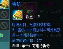 B、点击装备分解之后就会出现以下的物品【雪纺】。需要集齐5个才可以炼制变形卡哦,大家加油啦。如图:PS:过期和不过期的时装都可以炼制变形卡,另外也建议可以直接通过商城购买最便宜的10元宝时装来分解,这样也是比较合理的。