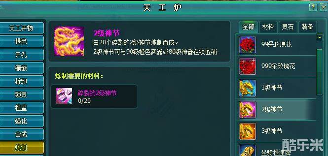 2、游戏中直接产出神节这个是很少很少的,所以只能通过破碎的神节来合成,需要20个才可以正常合成哦。破碎的1级神节合成完整的1级神节,破碎的2级神节合成完整的2级神节。合成步骤--天工炉--炼制---1(2/3)级神节。如图: