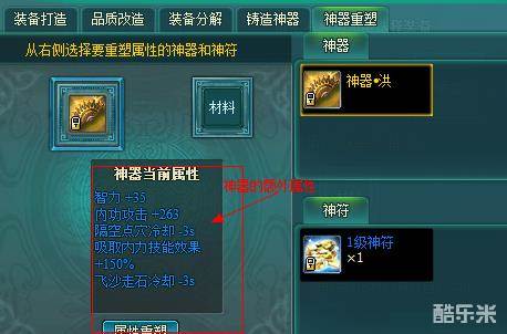 3、一个惊世武器降临了,大家一定很想知道具体是怎么样的啦,最后会给大家露个脸的,一个好的神器,还是需要对应好的额外属性才可以。那么如何对一个神器的属性进行重铸呢,这就需要用到上面介绍过的神符了。PS:86级神器对应1级神符,96级神器对应2级神符,以此类推。重铸神器属性步骤:铁匠铺(天工炉-铁匠铺)--神器重铸,如图: