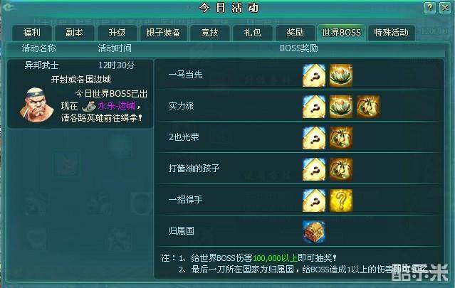 砍杀世界BOSS第一刀、最后一刀以及击杀BOSS伤血量排名前三的玩家,各自可获得一个特殊称号,以及一张【十二生肖】卡片,伤害前三名的玩家更可获得【神器礼包】,可开出【碎裂的3级神节】、【3级神符】等珍贵道具。其中,砍杀BOSS最后一刀的玩家,其国家将成为此世界BOSS的归属国,归属国国民可获得额外的奖励。