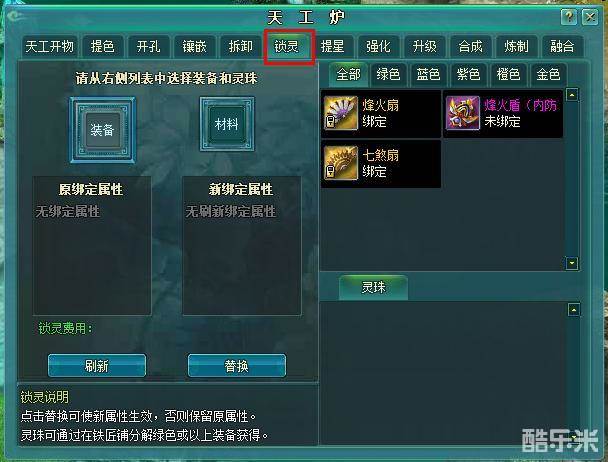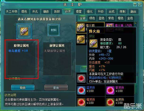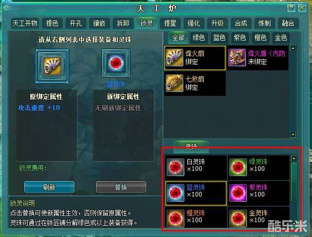 2.7如不满意这些属性,可以选择“刷新”,将重新刷新另外的属性,原本的“攻击速度+10”的属性不消失,每次刷新将消耗相应的一个灵珠; 2.8现在选择“替换”,替换后装备的附加属性变为: