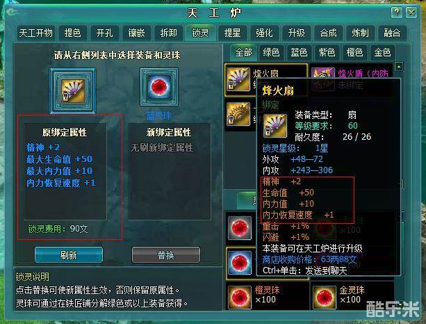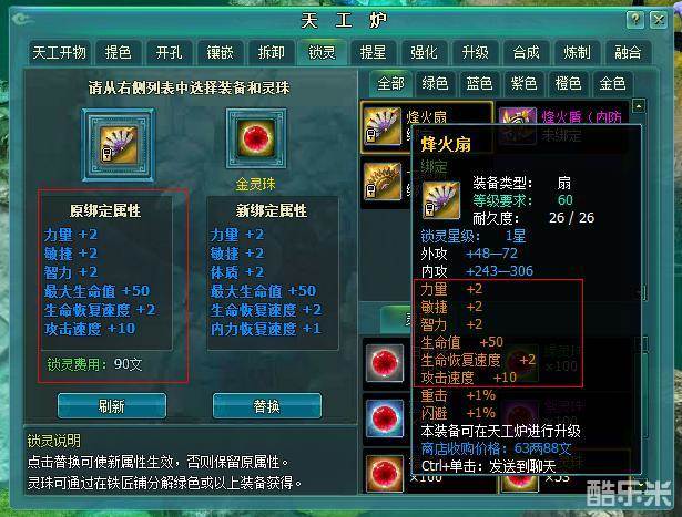 2.9放入珍贵的金灵珠,将装备的附加属性刷为自己喜欢的6条属性,每件装备最多可获得6条附加属性,大家可根据个人爱好选择自己喜欢的属性!现在【烽火扇】就有了6条非常猛的属性了。