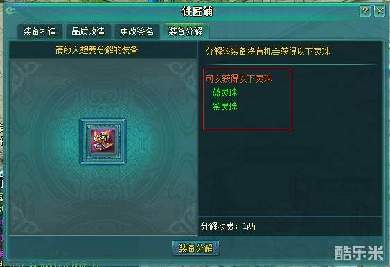 3、灵珠获得3.1灵珠分为:白灵珠、绿灵珠、蓝灵珠、紫灵珠、橙灵珠、金灵珠6个等级,金灵珠为最高级。3.2灵珠可以通过分解绿色及绿色以上的装备获得,玩家可前往“京城-铁匠”处通过“装备分解”来分解装备。