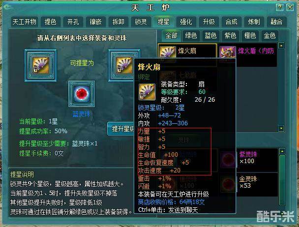 2、附加属性星级提升已经有了强悍的6条附加属性了,但是每条附加属性都只为1星,增加的属性点太少了,如何将附加属性升级到9级,获得更多的属性加成?2.1进入【天工炉—提星】界面,选择装备【烽火扇】,放入蓝灵珠,可以将附加的属性提升为2星。