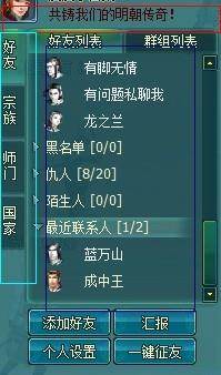 最后编辑于7年前在明朝传奇之旅中,一个好的伙伴是少不了的,正所谓在家靠父母,出外靠朋友嘛。其实在明朝传奇中,有个很人性话的好友聊天工具,该工具类似以腾讯的QQ。目前还是有很多朋友问我它的用法还有查一些朋友的好友度的,今天就大概的跟大家讲下。大概的如图: