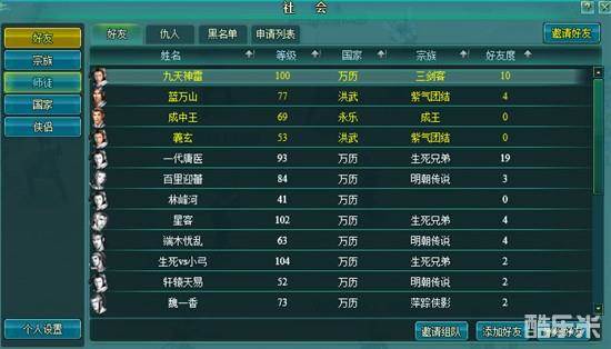 看到上面的窗口,我想很多玩家应该就知道了把,好友的宗族信息,好友度等都一目了然,另外其它的社会关系信息,如国家,侠侣,宗族等都可以在这里查看的。
