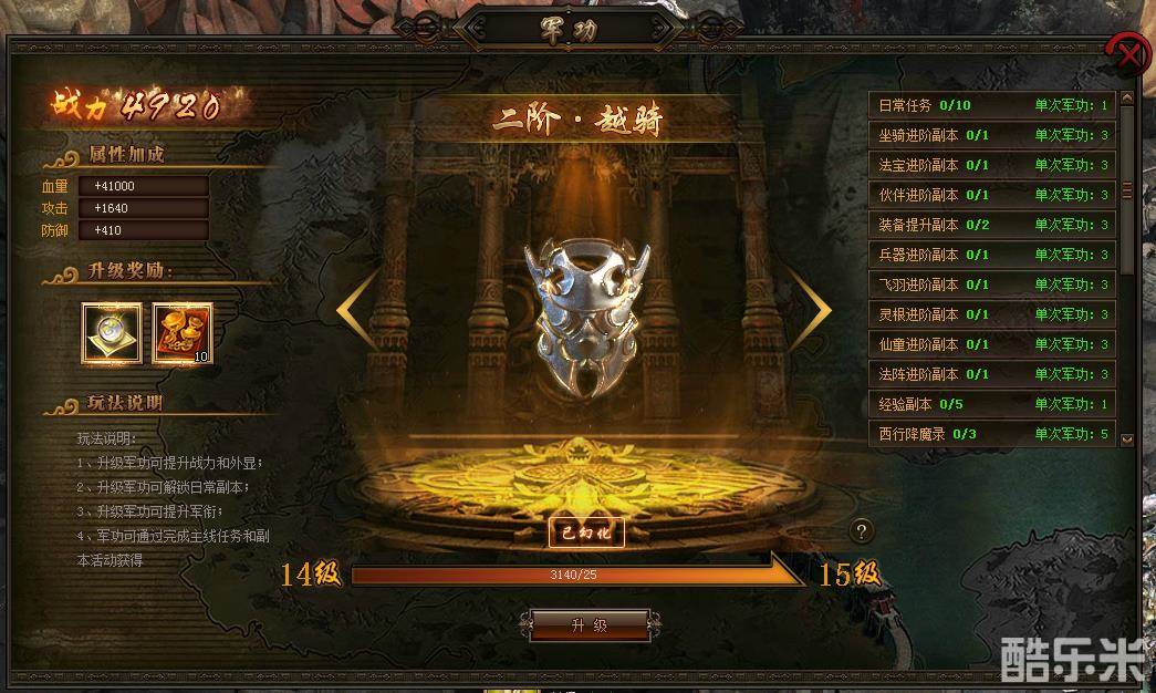 1)完成军功任务可以提升军功等级2)军功等级越高属性增加越多3)军功一个证明自身地位的系统,是否老玩家一眼变知